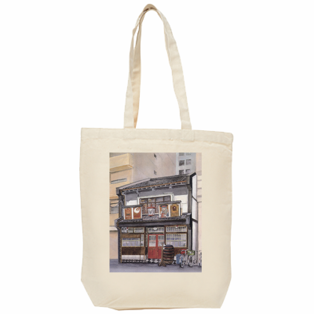 40年前の改装当時の店構えを絵画にしていました。2024年、株式会社徳岡が創業150年を迎え記念にこの絵をトートバッグにプリントしました。